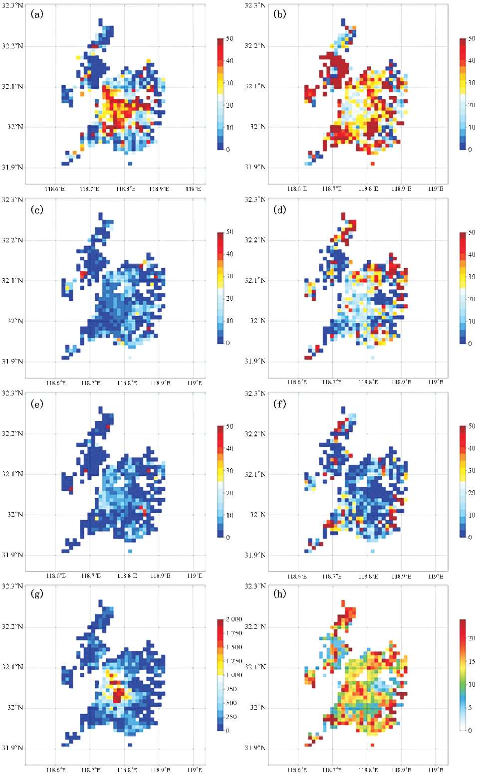 图3.1.7给出了南京建筑物高度分布概率空间分布。由图3.1.6(b),(c)可以看出λ p 和λ b 分布有较强的一致性,极大值都位于市中心,表明市中心建筑表面积最多,并且由图3.1.7(a),( g )可以认为市中心建筑表面积主要贡献来源于低矮建筑。南京市中心建筑物数量远远大于其他区域,10 m以下建筑物占比超过50%,南京市中心建筑物密度明显高于其他区域。南京20 m以上建筑主要分布在城市外围区域(图3.1.7(d)~(f)),这也就解释了为什么建筑物投影面积加权高度(Haw)在市中心和城市外围区域均有较大数值(图3.1.7(h))。