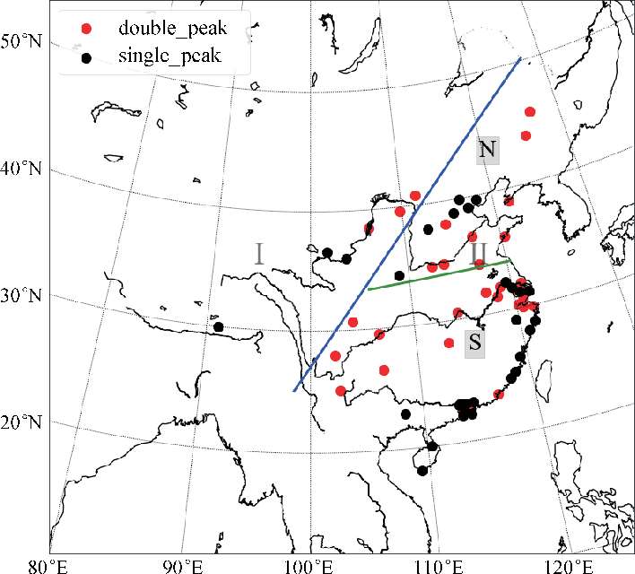图3.1.5 单双峰形态城市空间分布(红点代表双峰形态城市,黑点代表单峰形态城市,蓝线为“胡焕庸线”,绿线为秦岭—淮河线)