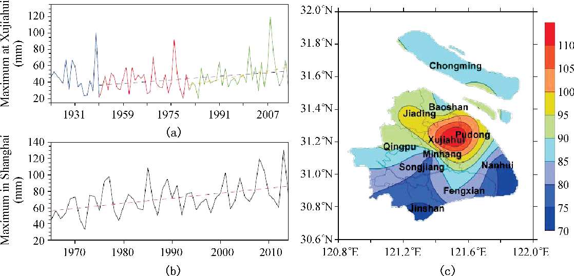 (a)徐家汇站百年记录;(b)上海地区所有站近50年记录;(c)1916年以来上海地区小时降水年极值的99.9百分位阈值空间分布(Liang and Ding,2017)