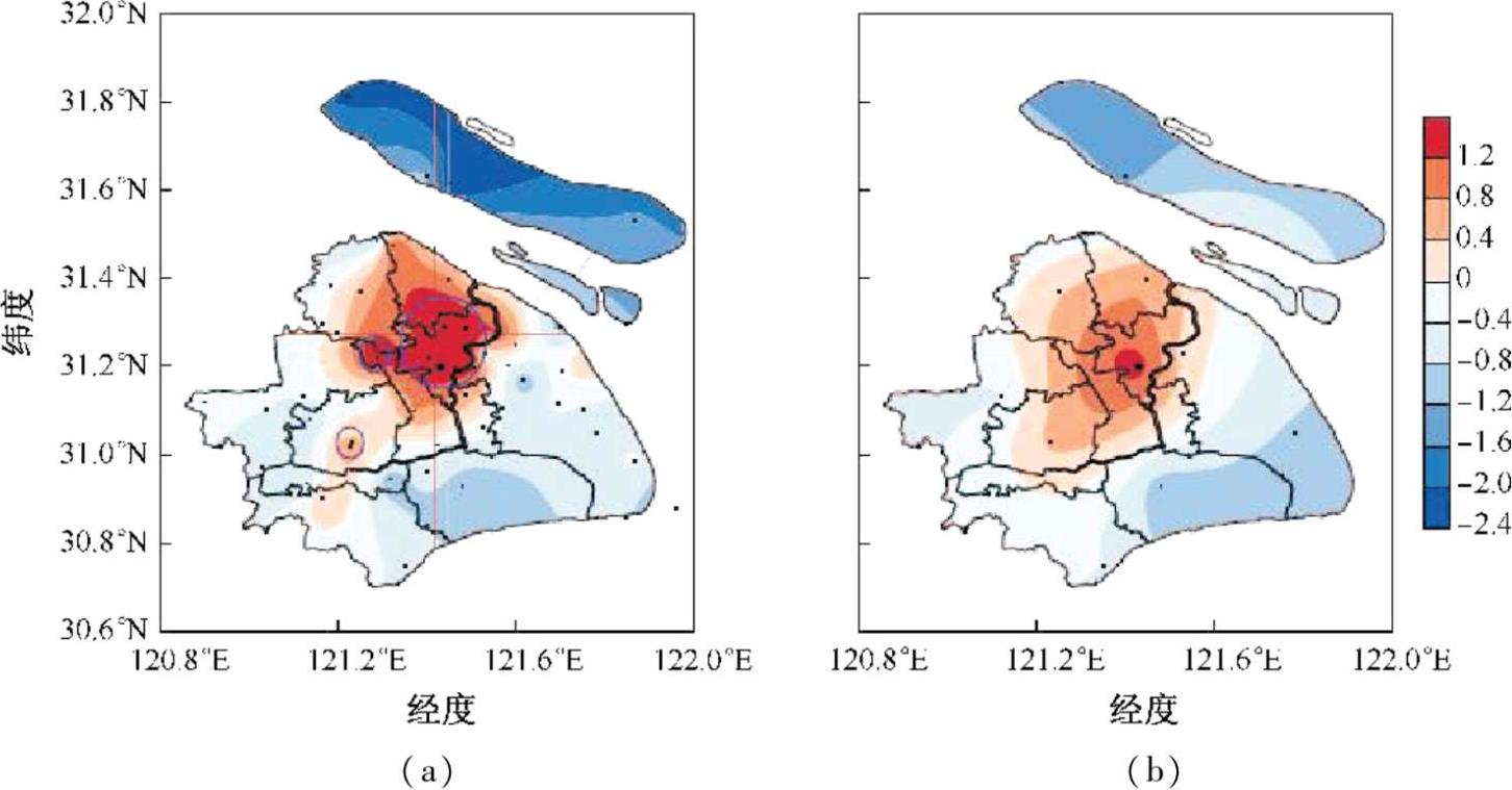 城市热岛效应是城市天气气候效应的最直接表现。早期的研究表明,1954—1983 年的30年里中国城市热岛强度普遍增加0.1 ℃(Wang et al.,1990)。Zhou等(2004)认为中国的城市热岛较其他国家尤为显著,且长江流域和华南的城市化使得城市气温的日变化幅度减小。21世纪初以来,越来越多自动观测站被用来检测城市气象要素,大大提高了城市热岛效应研究结果的准确性(Yang et al.,2013)。沈钟平等(2017)基于上海城市综合气象观测体系,采用质量控制后的加密自动观测数据揭示了上海城市热岛的多中心结构特征(图1.5.1),其季节变化受到大气环流季节转换和局地海陆风的影响。