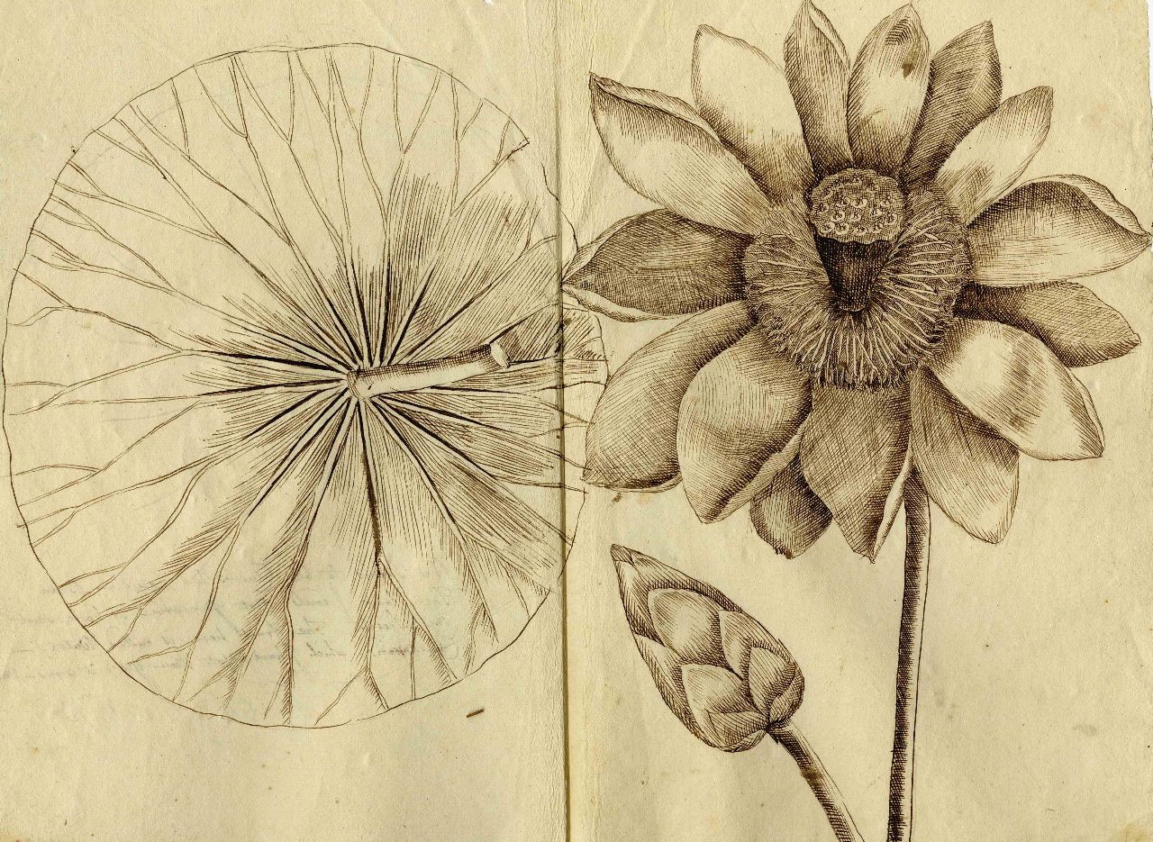 ▲ 1722年,马克·卡特斯比从北美洲殖民地的卡罗莱纳州(Carolina)向威廉·谢拉丹寄送了美洲莲的实地素描,并附有压叶和关于这种植物的身份和生态的说明