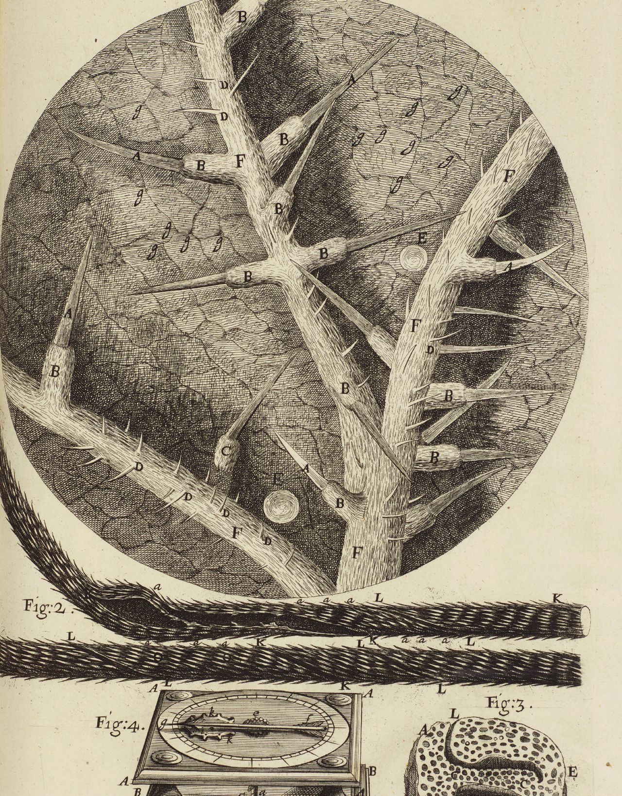 ▲ 罗伯特·胡克的《显微图谱,或放大镜观察微小物体的一些生理描述》(1665)中的普通荨麻叶被放大的表面