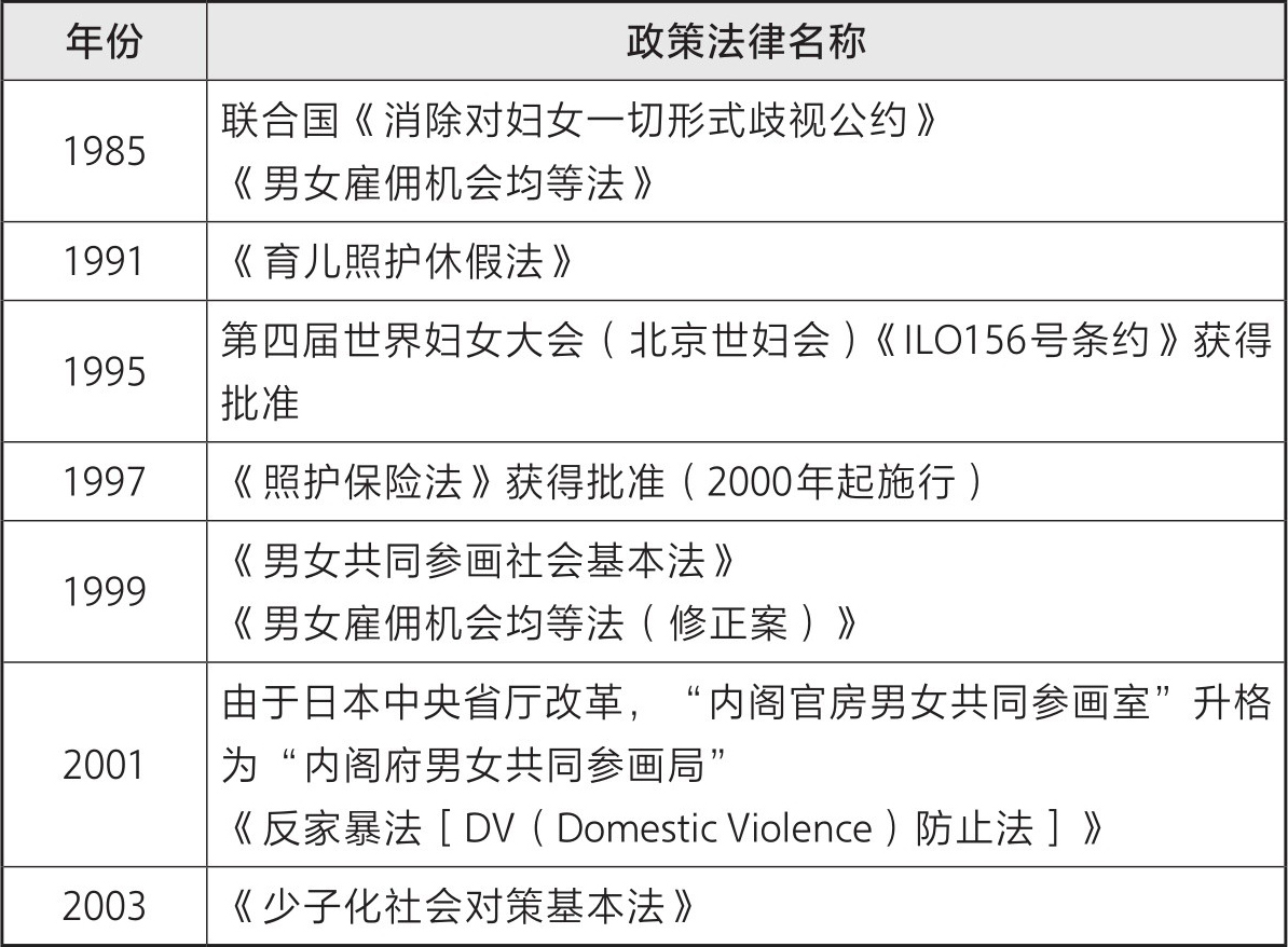 让我们展示一张日本自1985年联合国《消歧公约》批准以来性别平等政策成就的时间表(见表1-2)。在《消歧公约》批准的同时,《男女雇佣机会均等法》《国籍法(修正案)》等国内法相继出台,1999年颁布了《男女共同参画社会基本法》。同年,修订后的《男女雇佣机会均等法》将预防和应对工作场所性骚扰规定为“雇主的责任”。根据2001年的《反家暴法》,丈夫的家庭暴力终于被认定为违法行为。仅从法律的发展来看,自联合国公约批准以来,日本的“男女共同参画”政策远远不能望其他国家的项背。
