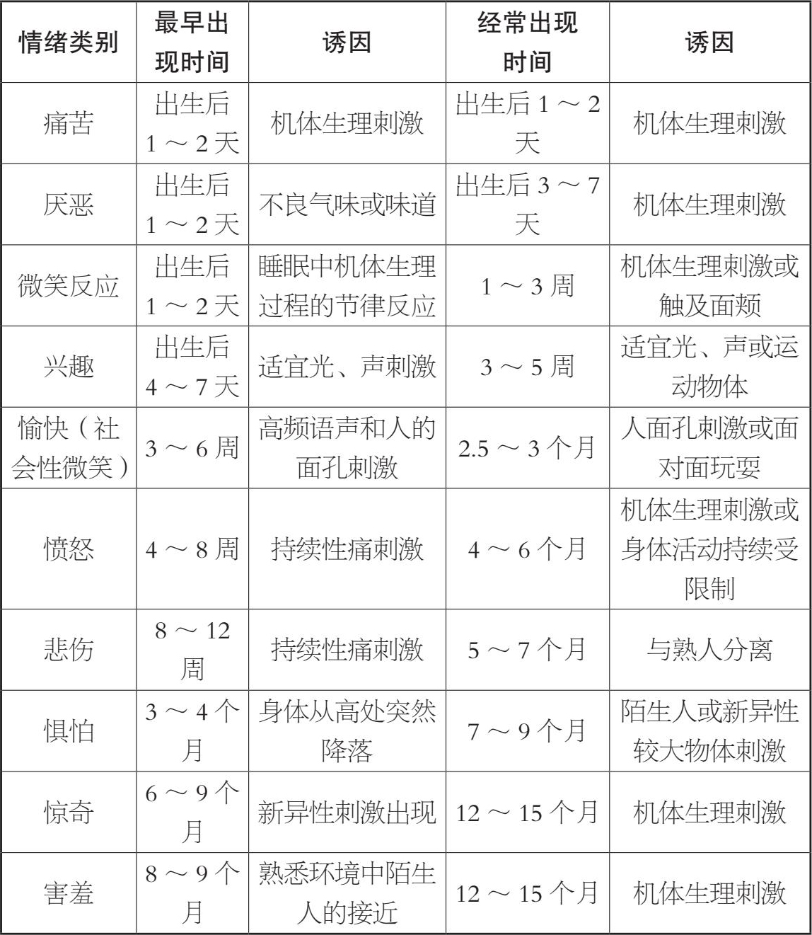 0~ 3岁的婴幼儿虽然逐渐掌握了语言,但是语言表达还不熟练,这个阶段,情绪仍是他们与周围世界、成人养育者之间进行互动的主要方式。这个阶段的情绪具有冲动、易变、外露、逐渐社会化的特点。虽然婴幼儿天生已经可以表达出8~10种基本情绪,但是每种情绪的发生时间和诱发原因是不同的,孟昭兰教授通过研究总结了以下发生时间表。