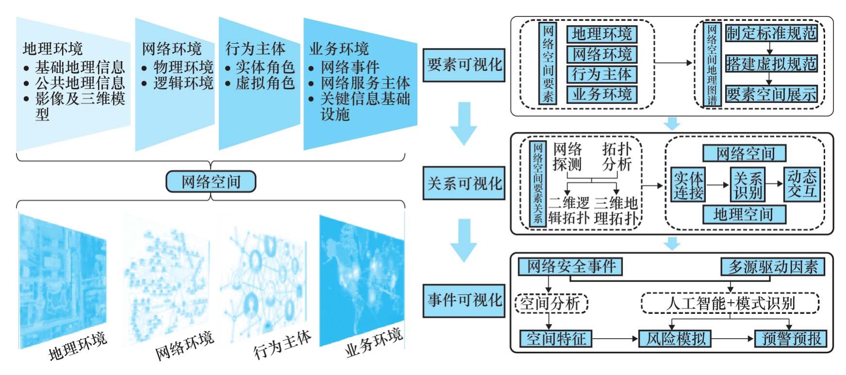 地理环境层、网络环境层、行为主体层和业务环境层4个层次的要素之间相互联系、相互影响,共同构成了网络空间要素体系。