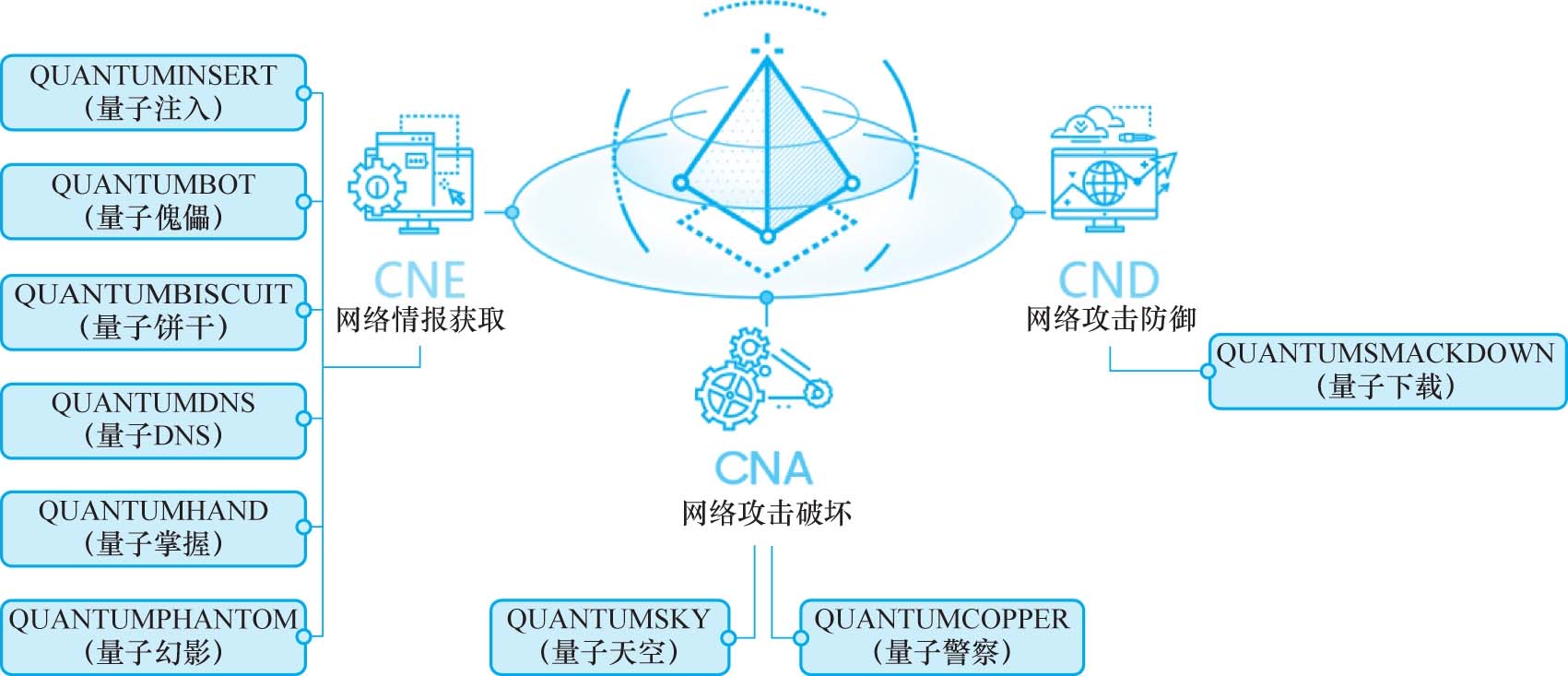 三是网络武器平台体系化、集成化。 这方面的例子也很多,如2012年美国军方开始资助所谓的“X计划”。“X计划”包含了网络态势感知等极其丰富的内容,但其中一个很重要的元素或者组成部分,就是试图把各种网络武器集成到同一个平台上。其设想是能够让每一个作战单位,甚至每一个具体执行任务的士兵,都能够从这个平台选择想要的网络武器发动攻击,因此这种平台体系化趋势越来越明显。再比如2022年披露的Quantum(量子)攻击系统,是APT 组织APT-C-40针对国家级互联网专门设计的一种先进的网络流量劫持攻击技术,具有“QUANTUMINSERT(量子注入)”“QUANTUMBOT(量子傀儡)”“QUAN-TUMBISCUIT(量子饼干)”“QUANTUMDNS(量子DNS)”“QUANTUMHAND(量子掌握)”“QUANTUMP HANTOM(量子幻影)”“QUANTUMSKY(量子天空)”“QUANTUM-COPPER(量子警察)”“QUANTUMSMACKDOWN(量子下载)”九大功能模块,分为QUANTUM Capabilities网络定位、QUANTUM SIGDEV网络监控和QUANTUMNATION操作进入三个QUANTUM(量子)攻击实施过程,已完全实现了工程化、自动化(见图1-8)。据NSA(National Seacrity Agency,美国国家安全局)官方机密文档 Quantum Insert Diagrams 内容显示,QUANTUM(量子)攻击可以劫持全世界任意地区、任意网络上用户的正常网页浏览流量,实施漏洞利用、通信操控和情报窃取等一系列复杂网络攻击。