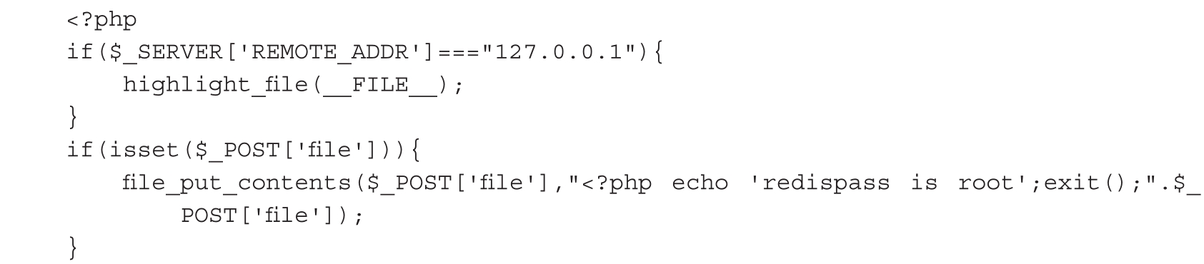 代码中有一个file_put_contents文件写入,但是会在文件的开头添加<?php echo 'redispass is root';exit();来强制退出代码执行。我们可以通过php伪协议绕过,但是这里限制了协议,所以此处绕不过去。请读者留意redispass is root这段代码,它表示存在Redis而且密码为root。