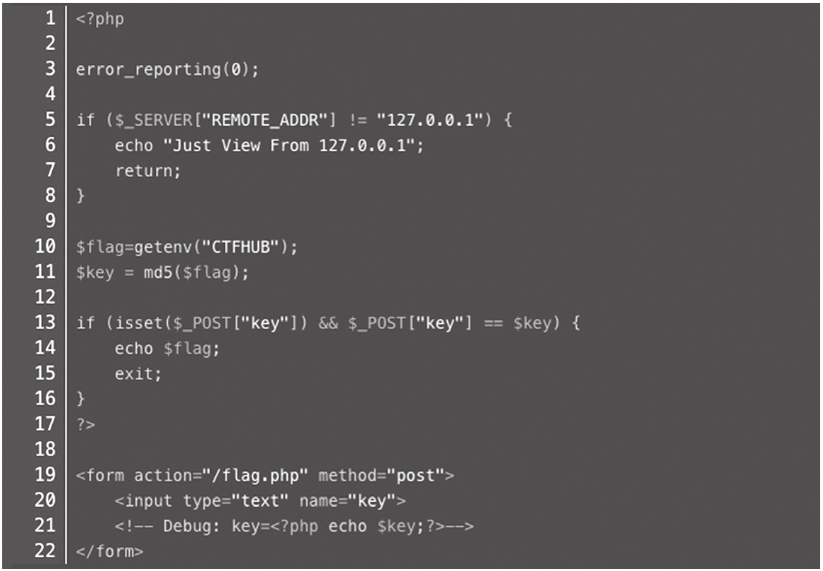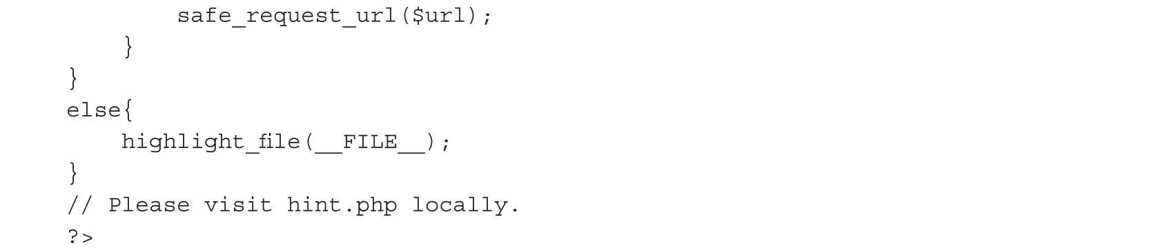 直接通过http://0.0.0.0即可绕过,这个IP表示本机IPv4的所有地址。根据提示,访问url=http://0.0.0.0/hint.php。得到hint.php源码,代码如下。