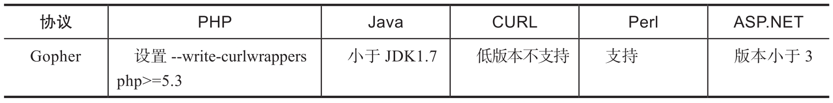 Gopher协议的格式为gopher://127.0.0.1:70/_+ TCP/IP数据,这里的_是一种数据连接格式,也可以是任意字符。Gopher协议在各种编程语言中的使用限制如表1-5所示。