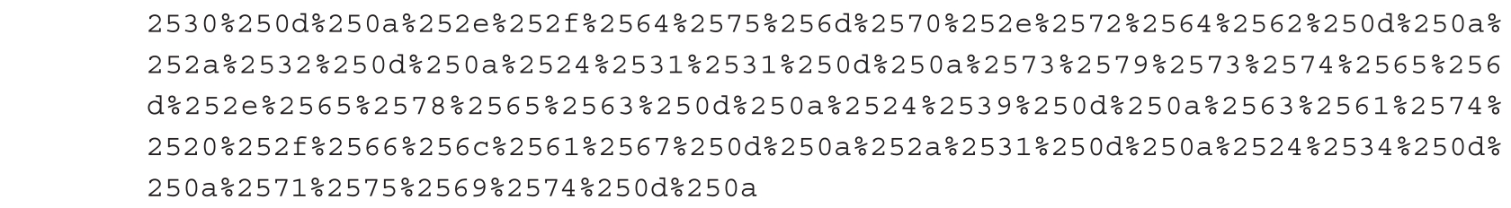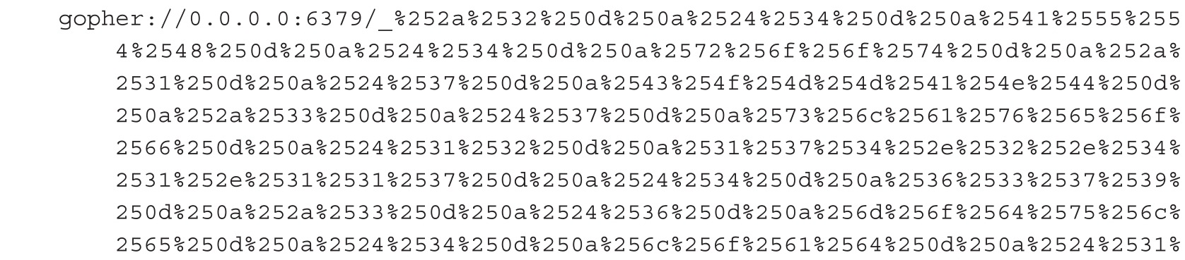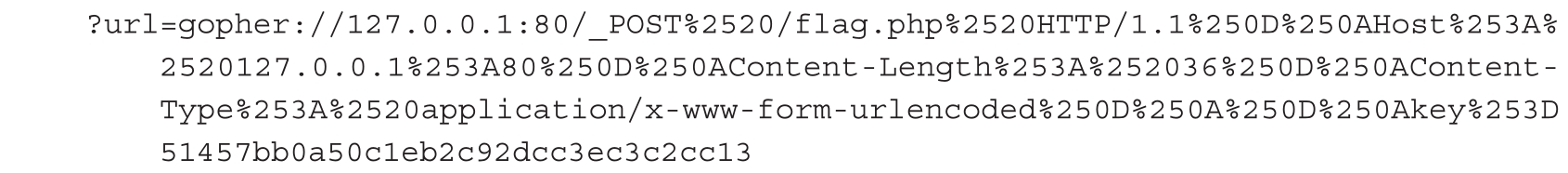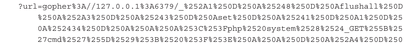 将第一次编码后的数据中的%0A全部替换为%0D%0A。因为Gopher协议包含的请求数据包中,可能包含=、&等特殊字符,为避免与服务器解析传入的参数键值对混淆,所以对数据包进行第二次URL编码,这样服务端会把%后的字节当作普通字节。进行第二次URL编码,得到如下Gopher请求内容。