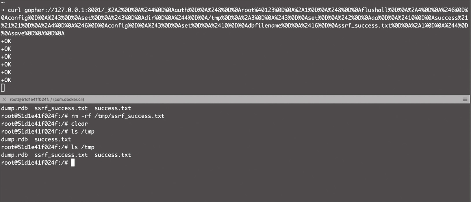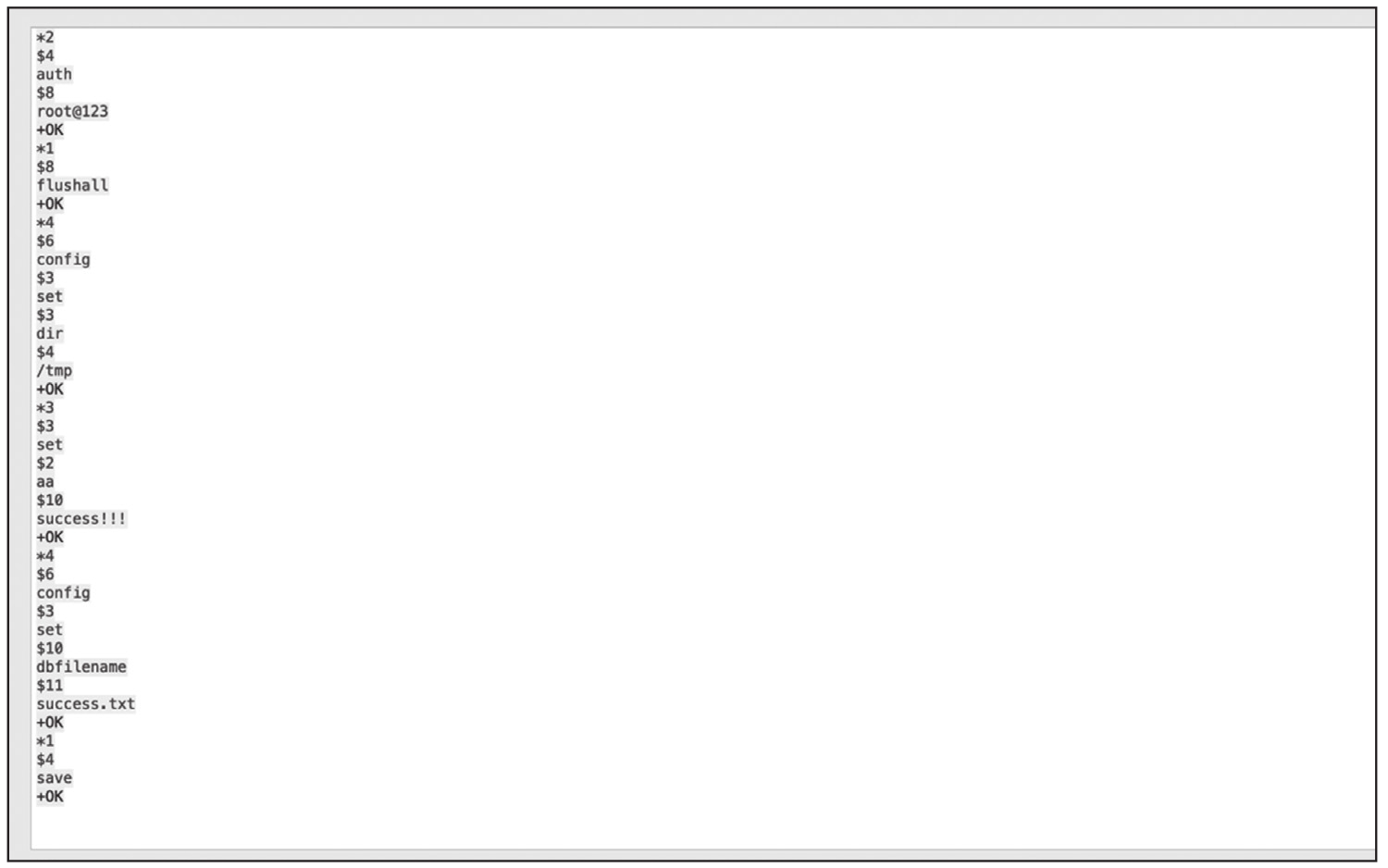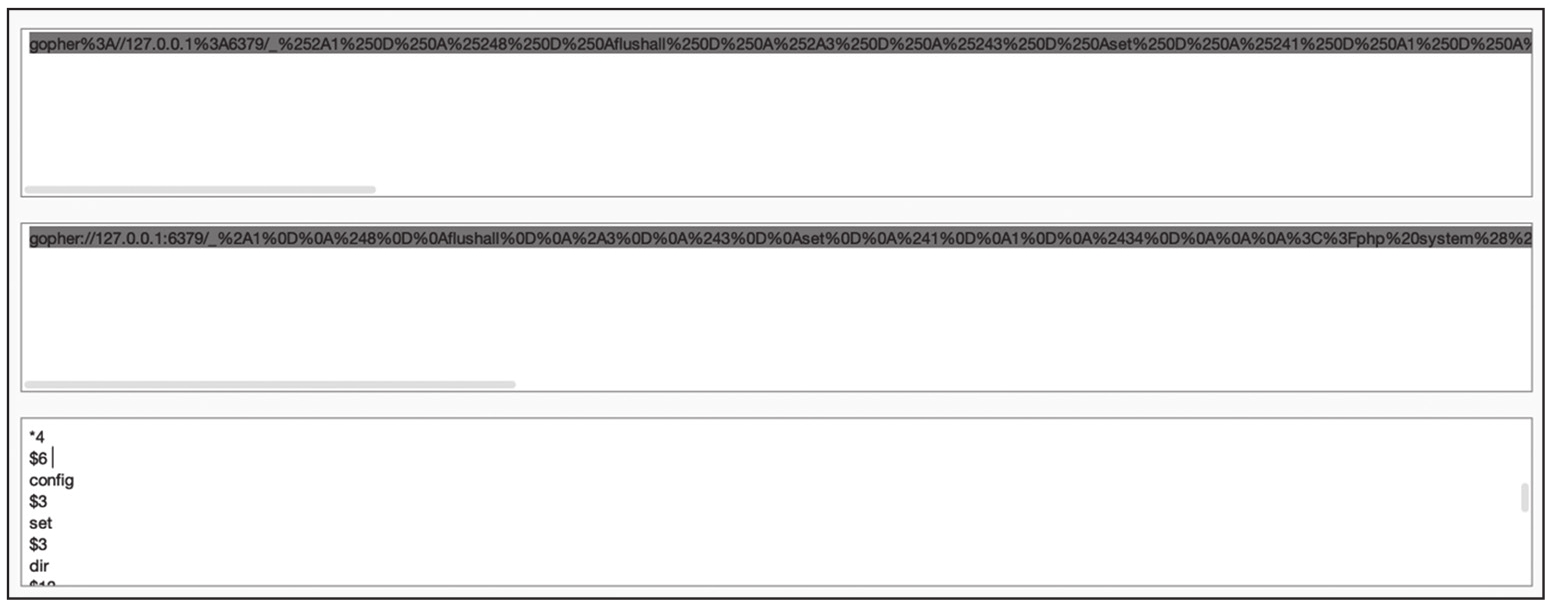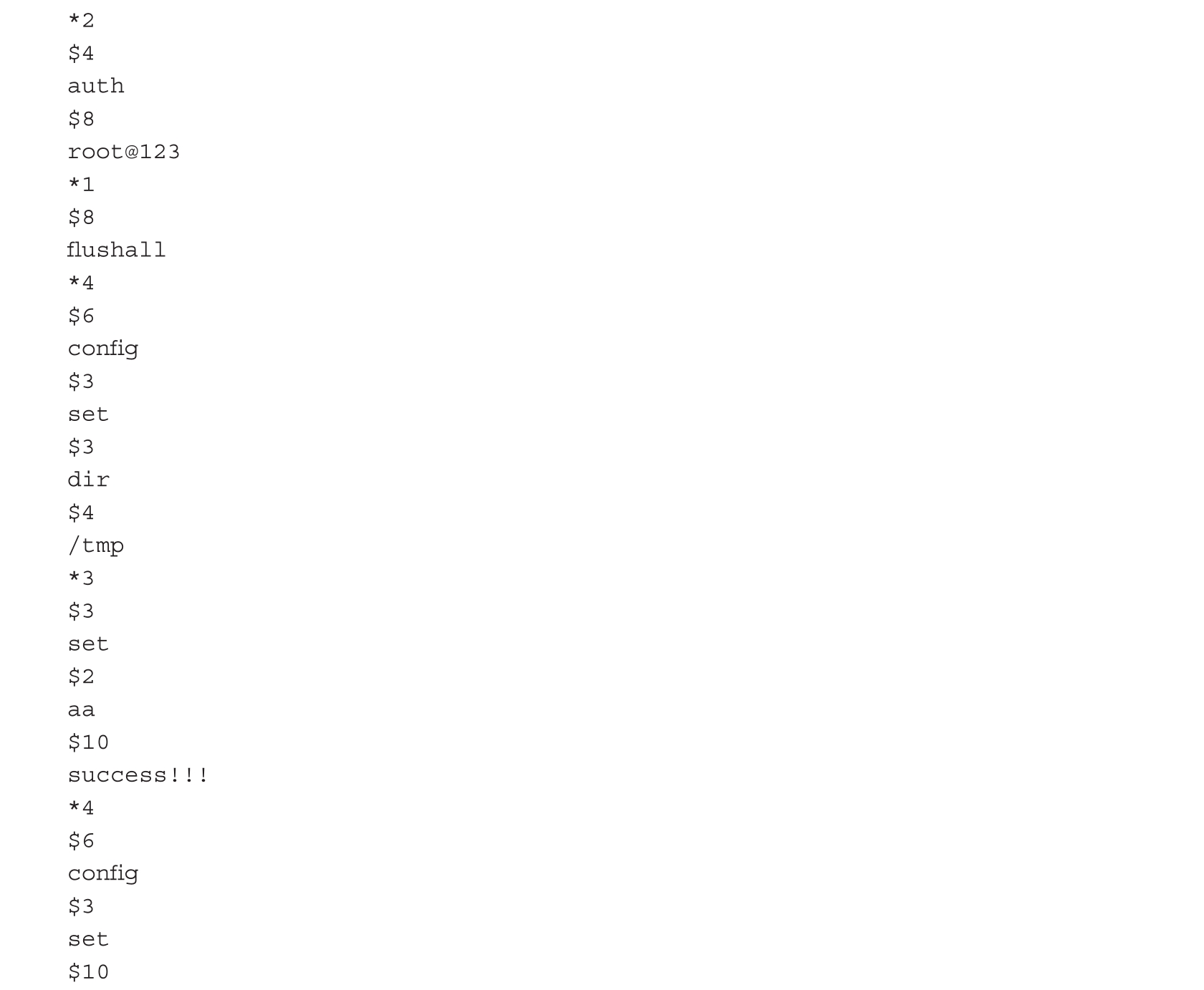 我们只需要在这些指令前面加上认证的指令,即可利用有认证的Redis服务写入任意文件。我们来试着构造一个包含认证部分的Payload,通过SSRF写一个ssrf_success.txt到tmp目录下,需要构造的指令如下。