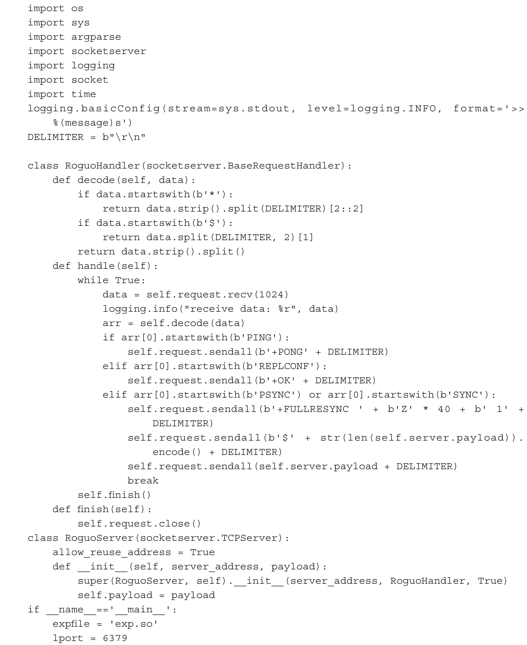 通过Gopher协议发送Redis指令和目标建立主从关系,这样我们构造的exp.so文件也会被复制过去,接着通过exp.so文件构造一个Redis命令system.exec,调用我们构造的system.exec指令就可以执行任意命令了,代码如下。