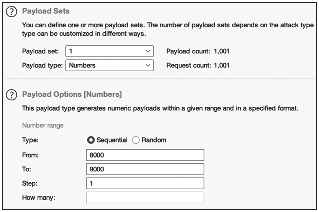设置Payload类型为Numbers,这是因为题目提示端口号范围在8000~9000之间,设置如图1-85所示。