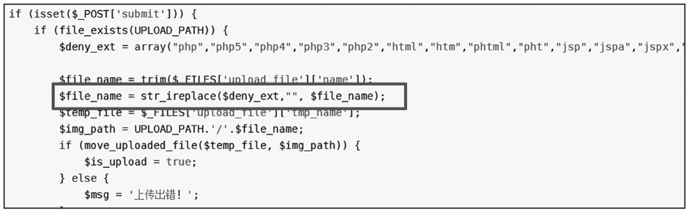双写后缀绕过主要是利用了这个特点:有些程序的逻辑是在检测到非法后缀名后没有中断上传,而是使用了删除非法后缀名并依然将其保存在服务器上。如图1-128所示,程序如果检测到后缀名在黑名单数组中,就将其替换成空,但依旧将替换后的文件保存在服务器中。