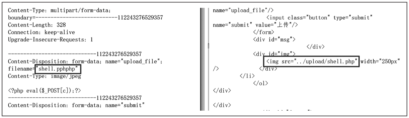 我们可以利用这个特点,构造“shell.pphphp”。因为替换只发生了一次,这样文件名被替换后就变成了“shell.php”,正好符合我们的预期,如图1-129所示。