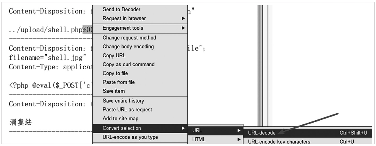 如果上传的文件在POST数据的地方,我们就需要使用00的形式。最方便的做法是在Burp Suite截取的包中找到要截断的地方并打上%00,选择Convert selection→URL→URL-decode,如图1-132所示。