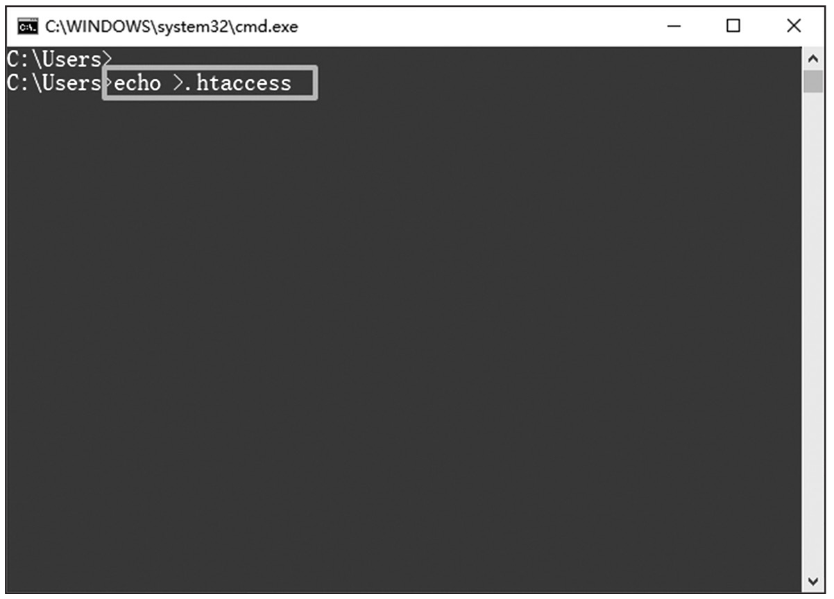 首先创建一个.htaccess文件,如果系统提示不能创建没有名字的文件,可以打开cmd,通过echo命令创建,具体如图1-140所示。