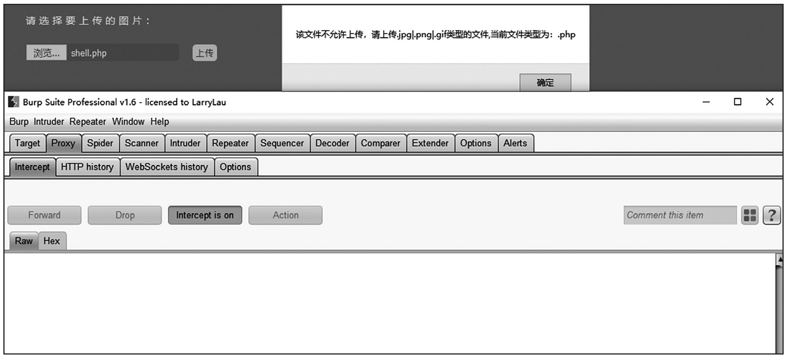 点击“上传”后发现文件被拦截,但是Burp Suite没有反应,这说明我们并没有和远程服务器进行交互,如图1-117所示。