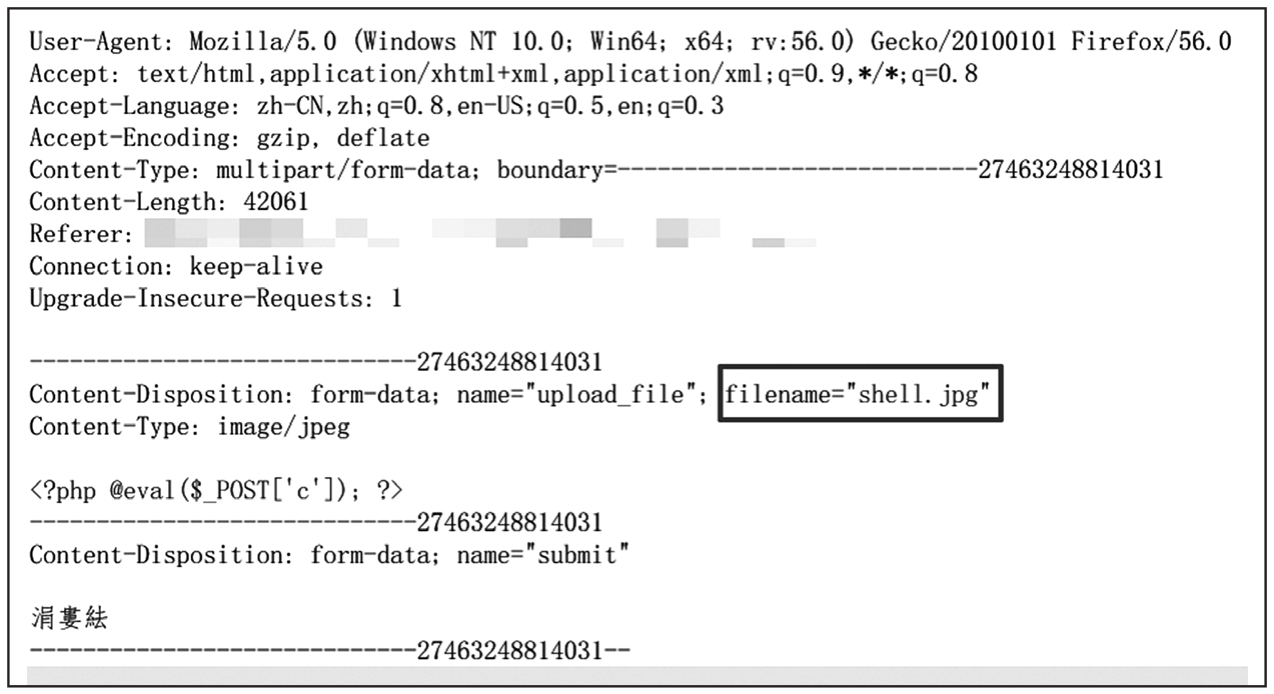 程序的逻辑很简单,运行时会在同目录下生成一个名字为shell.php的WebShell。首先抓取上传该文件的HTTP包,如图1-159所示。