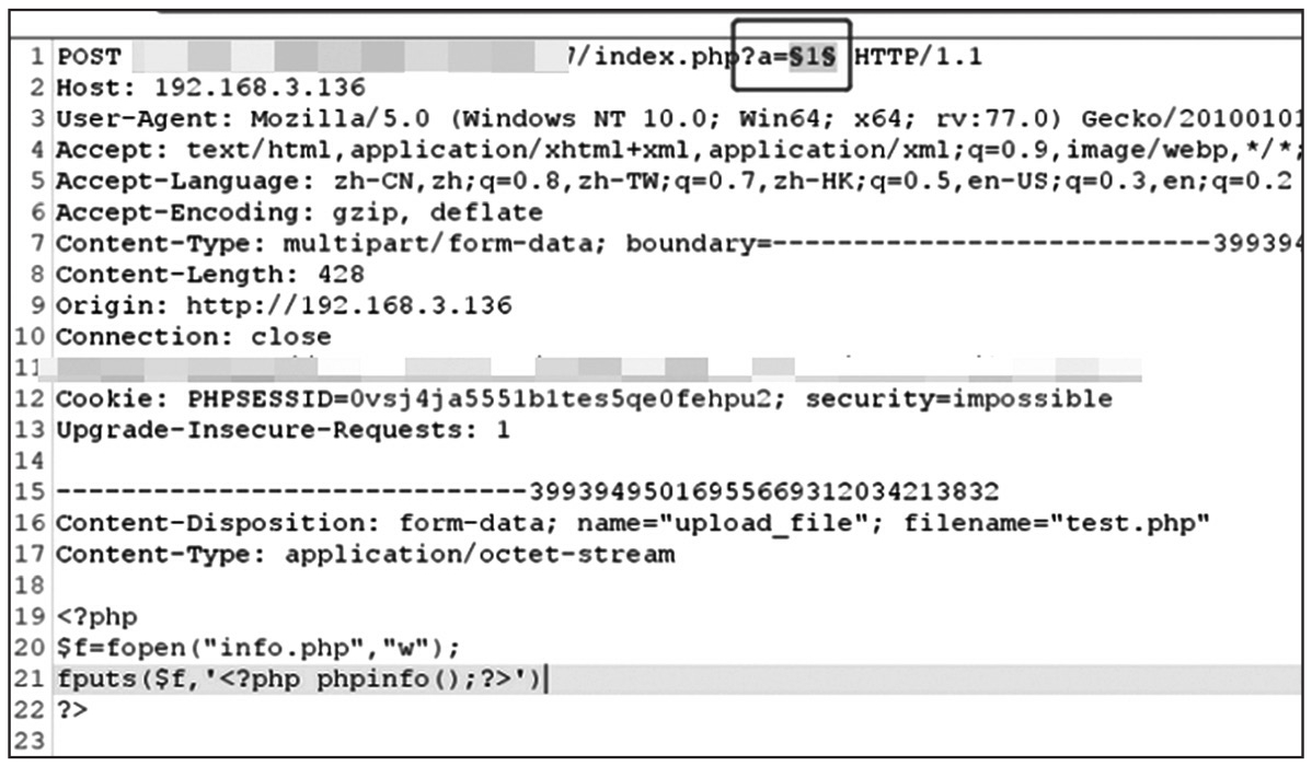 条件竞争是指基于网站允许上传任意文件,检查上传文件是否包含WebShell,如果包含则删除该文件,并且如果文件不是指定类型,那么使用unlink指令删除文件。上传的文件在程序运行过程中在服务器上短暂保存了一下,无论程序执行得多快,理论上如果不停地访问和上传,总会有访问成功的时候。我们可以这样规定上传的文件内容,如图1-158所示。