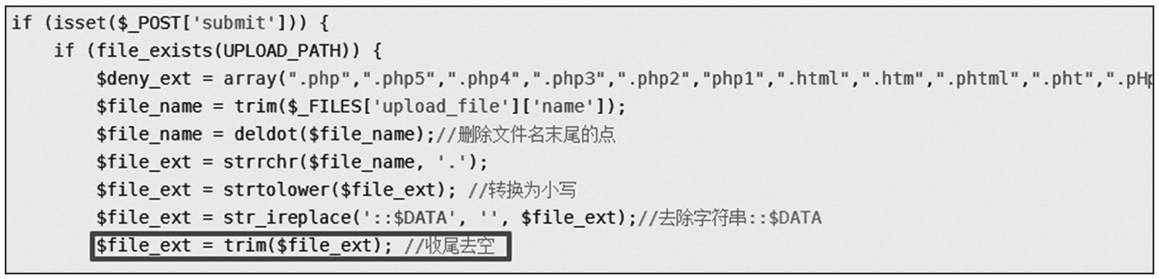 有些开发者在检测上传文件的后缀名时,在最后会添加去除空格等特殊字符的操作,我们可以利用该特点进行黑名单绕过,如图1-123所示。