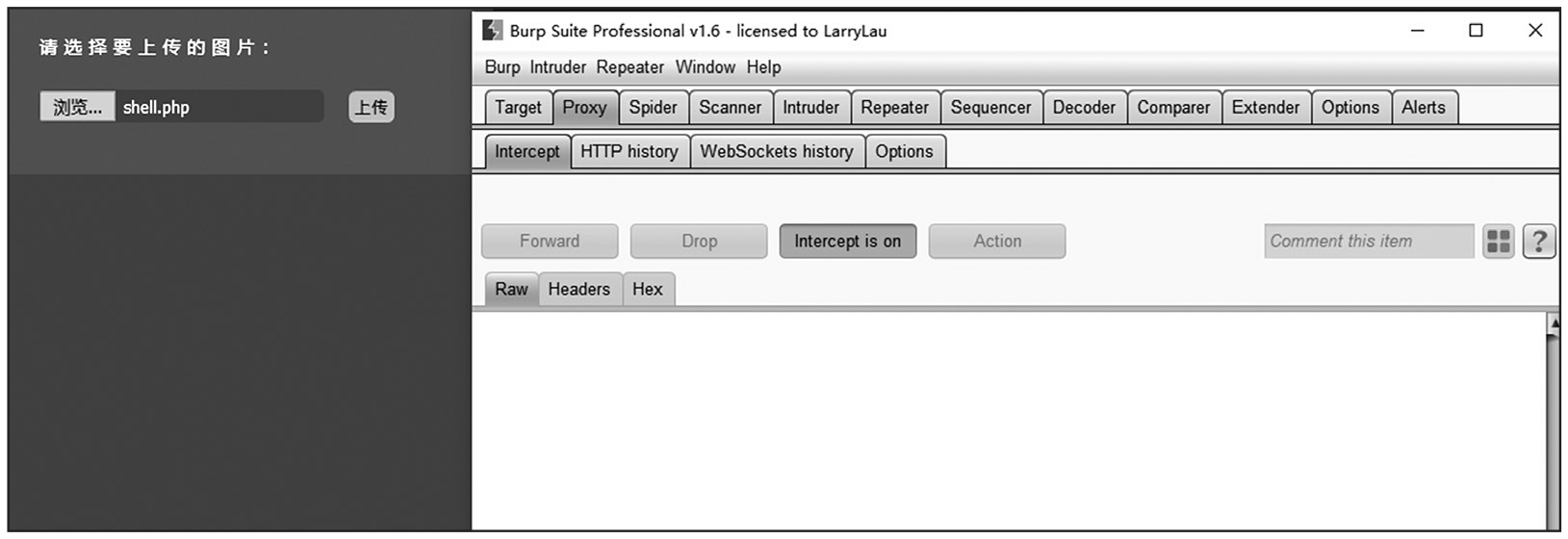 首先我们开启Burp Suite,对上传的动作进行抓包,如图1-116所示。