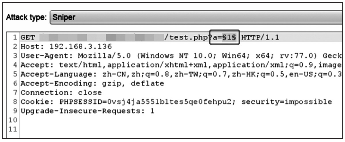 将以上两个报文都发送至intruder模块。在报文的URL中加上?a=1,并将a设置为变量,用于不断发送,如图1-161所示。