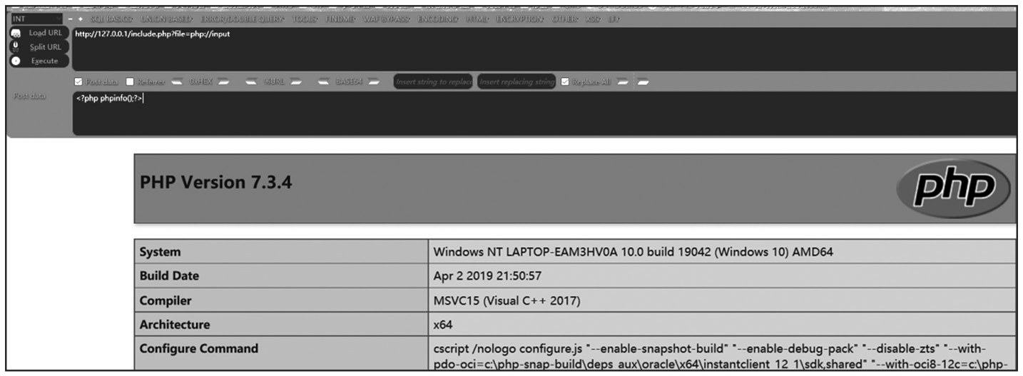 php可以访问请求的原始数据的只读流。简单来说,就是可以将POST部分的完整内容看作被包含的文件内容。与普通的文件包含不同的是,该方法并不需要本地或外部服务器上存在该文件,因为最终包含的是文件内容,其他的内容并不是非常重要,利用方法如图1-174所示。