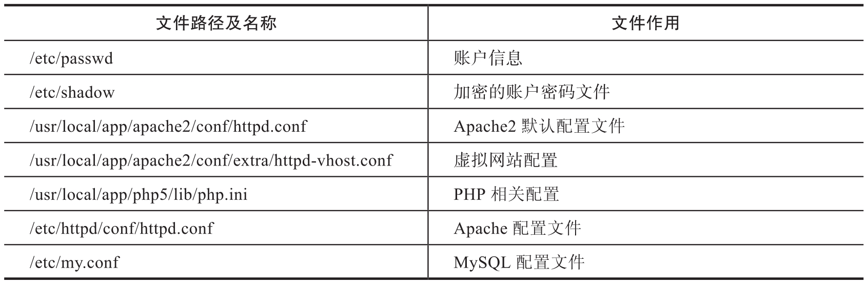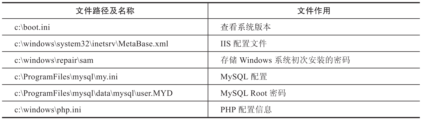 下面介绍一些在实战中常用的系统敏感文件,表1-6、表1-7分别给出在Windows系统下和在Linux系统下的一些常见敏感文件。