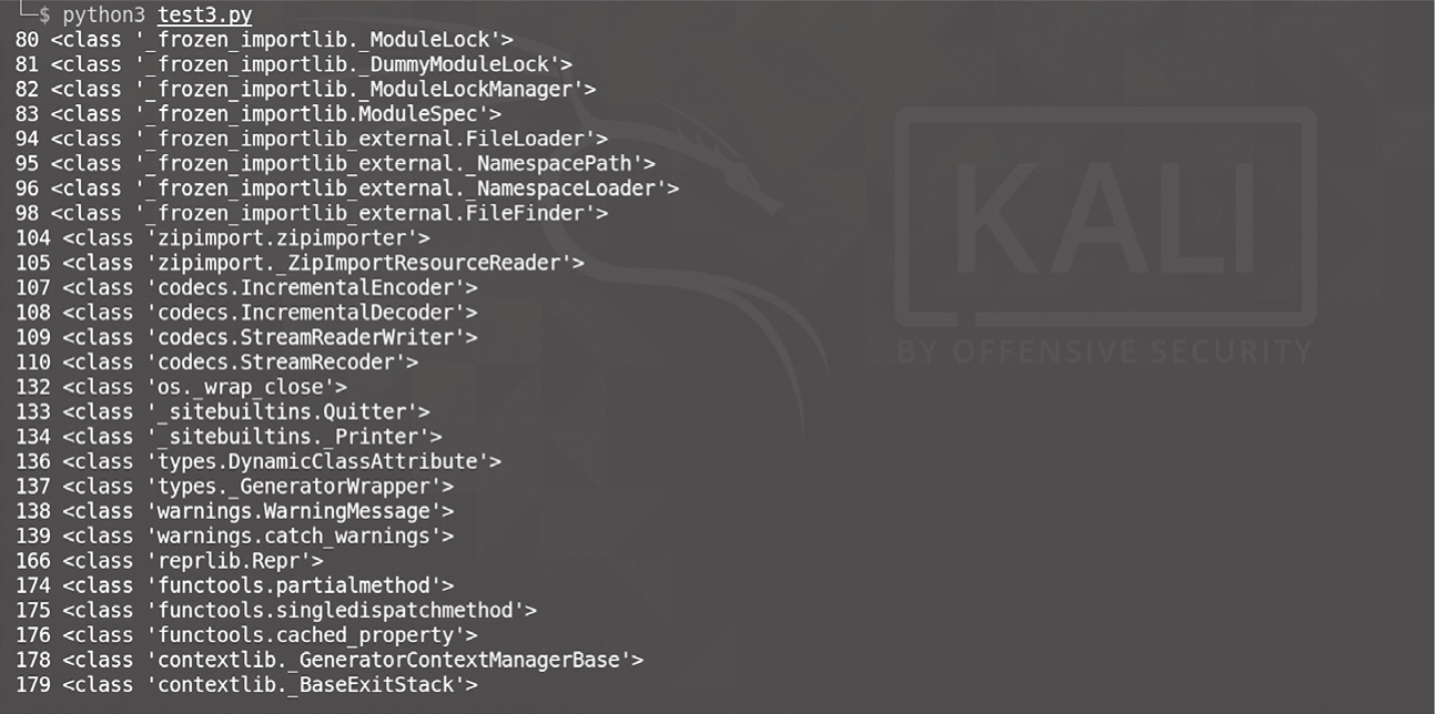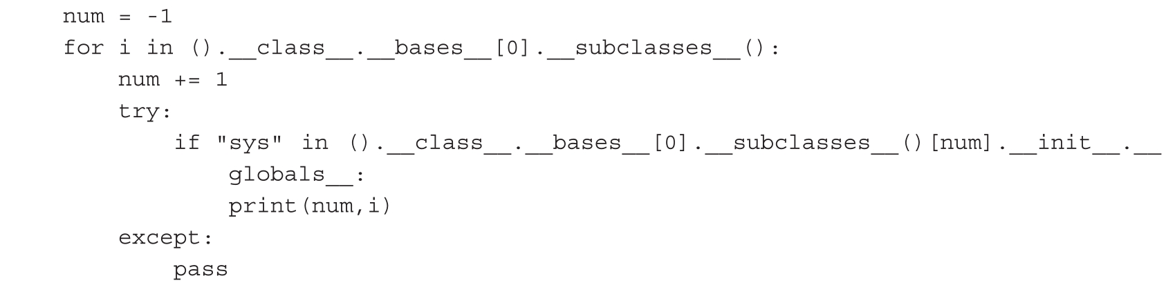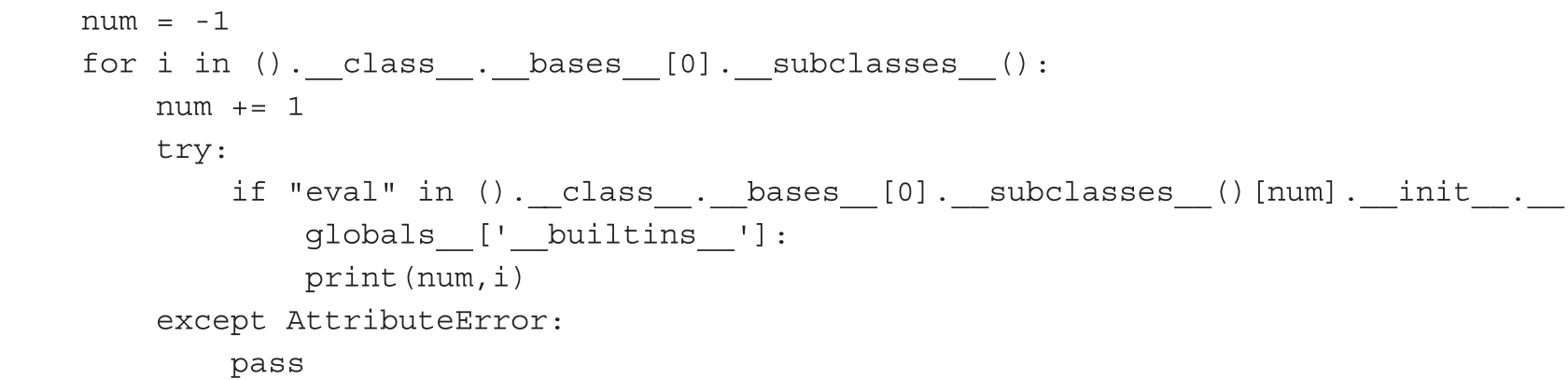 如果通过内置函数构造可用于SSTI执行系统命令的Payload,则需要遍历含有eval内置函数的子类,我们可以写一个脚本进行遍历,代码如下。
