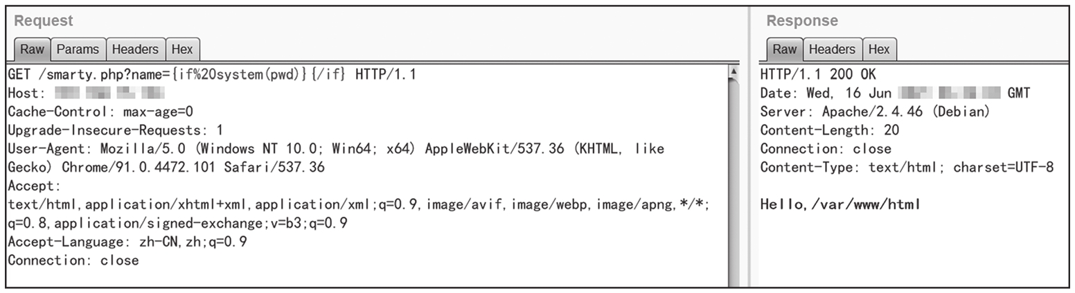 从返回的结果中发现存在SSTI漏洞,有些利用方法在新版的Smarty中已经不再适用,这里使用if标签构造Payload为“{if system(pwd)}{/if}”,结果如图1-208所示,成功利用SSTI漏洞执行了系统命令。