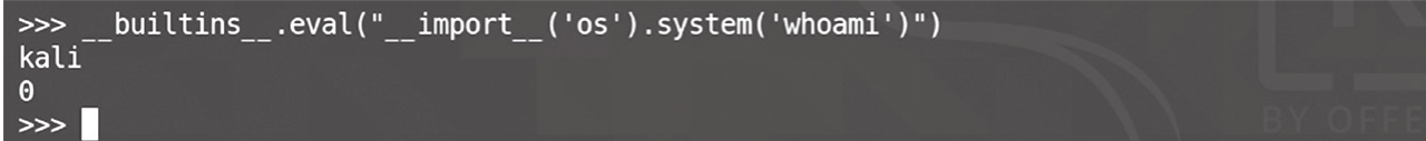 知道了__builtins__模块与内置函数的关系后,我们可以直接使用__builtins__来调用内置函数。在Python解释器中输入__builtins__.eval("__import__('os').system('whoami')"),结果如图1-218所示,可见执行了系统命令。