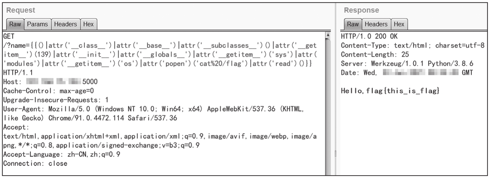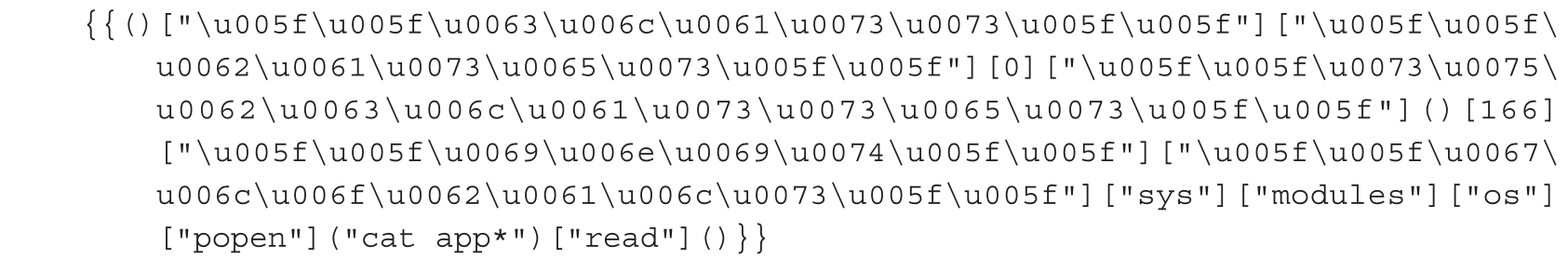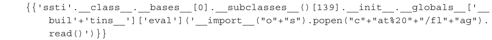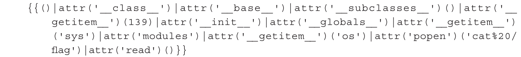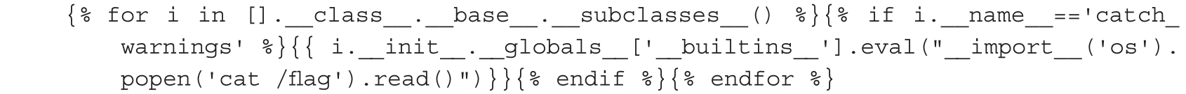 当题目过滤了大括号“{{”或“}}”时,我们可以使用Jinja2模板引擎的“{%...%}”语句装载一个循环语句来进行绕过,Payload代码如下。