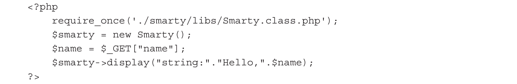 新建smarty.php文件,代码如下所示,程序定义了一个name变量为用户输入的内容,没有启用沙箱模式,直接使用Smarty模板引擎的display()方法渲染当前页面。