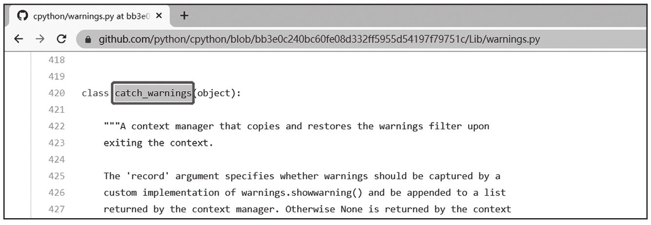 为了更直观地了解其中的原理,我们查看catch_warnings类的源码,如图1-214所示。