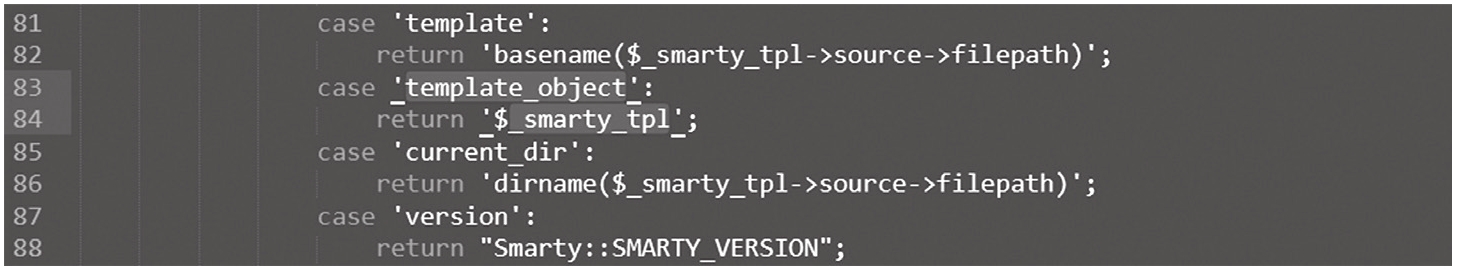 漏洞产生的根本原因是Smarty从$smarty.template_object超级变量中访问实例,在smarty_internal_compile_private_special_variable.php文件的compile()函数中,返回了一个$_smarty_tpl,如图1-227所示。