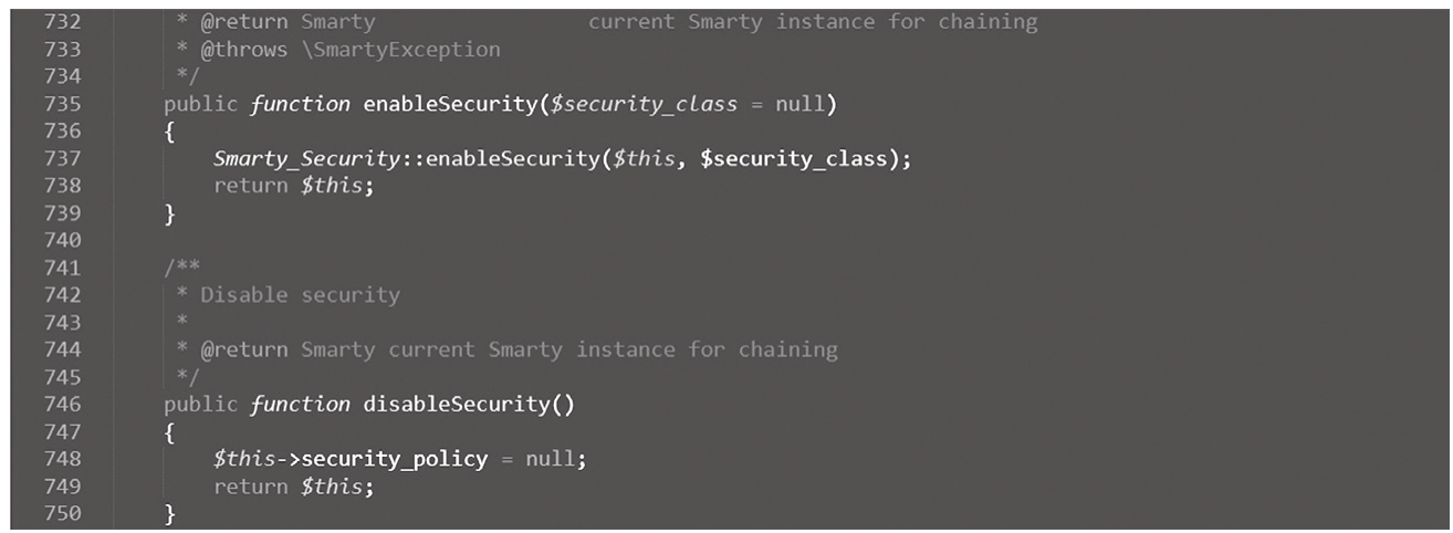 而开启和关闭沙箱的方法都在smarty类中,如图1-229所示,这意味着我们可以通过调用disableSecurity()函数关闭沙箱后再调用父类的display()函数执行任意PHP代码。