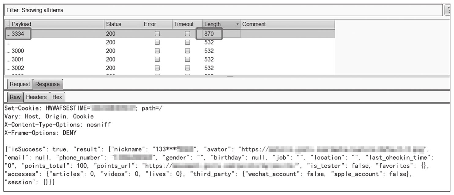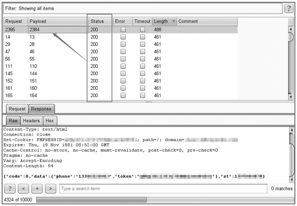 根据手机实际收到的短信验证码,发现短信验证码为4位数字,并且有效时间为30分钟。猜想可能存在任意用户注册和任意用户登录漏洞,使用验证码登录时直接抓包爆破验证码的值,结果不出所料,如图1-243所示,成功实现任意用户登录。