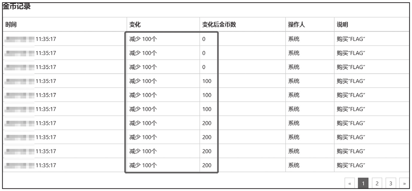 最后成功利用并发漏洞兑换了20个FLAG商品,查看金币记录可以发现,这些数据有一部分是错误的。正常情况下购买商品后金币数量应当每次减少100个,而利用并发漏洞兑换商品时,兑换完一个商品后金币没有发生变化,甚至金币降为0后也能继续兑换几个商品,如图1-254所示。