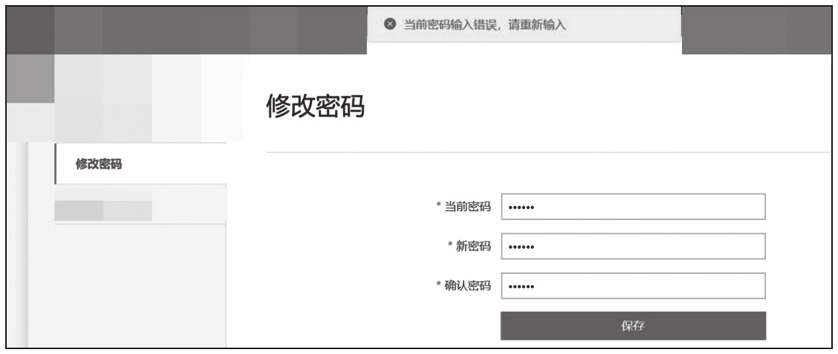 注册并登录后,进入后台的个人信息修改页面,首先进行一个正常的修改密码流程,输入一个错误的密码进行修改时,页面提示“当前密码输入错误,请重新输入”,如图1-270所示,这说明服务端确实针对旧密码进行了校验。