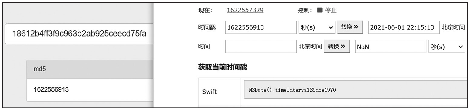 将获取的sukey进行MD5解密后发现是时间戳,再将时间戳转换为时间就明白了其中的原理,如图1-281所示。sukey的加密方式比较简单,仅仅是将时间戳进行MD5加密。