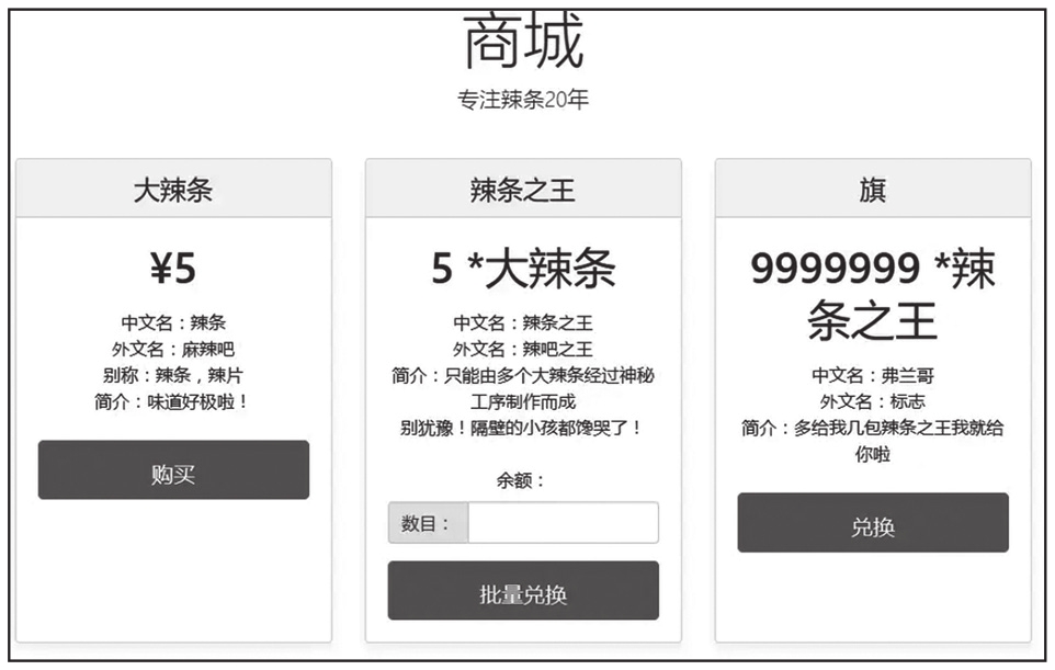 题目背景是一个辣条商城,如图1-278所示。简单分析一下商城功能:每个新用户注册即送20元,5元可以兑换一个大辣条,5个大辣条可以兑换一个辣条之王,9999999个辣条之王才可以兑换flag。