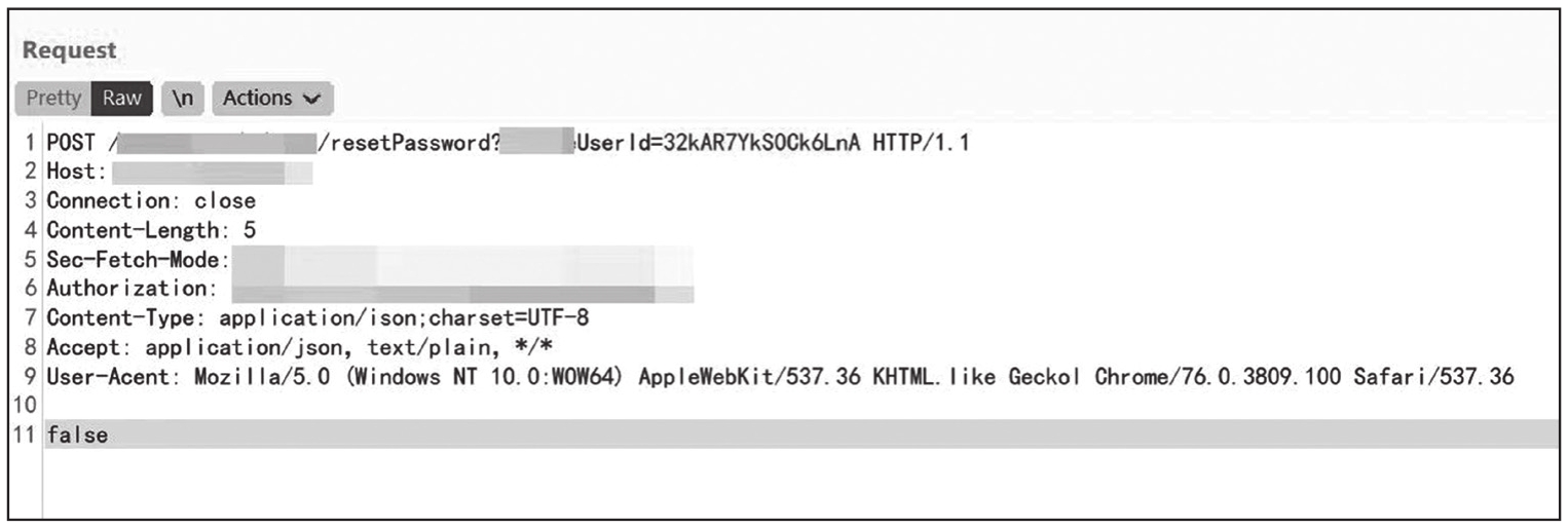 点击重置密码时进行抓包,可以看到是根据Userid对用户进行密码重置的,如图1-275所示。默认情况下Userid是加密的,且无法解密,因此不能利用遍历Userid值的方法进行任意用户密码重置。
